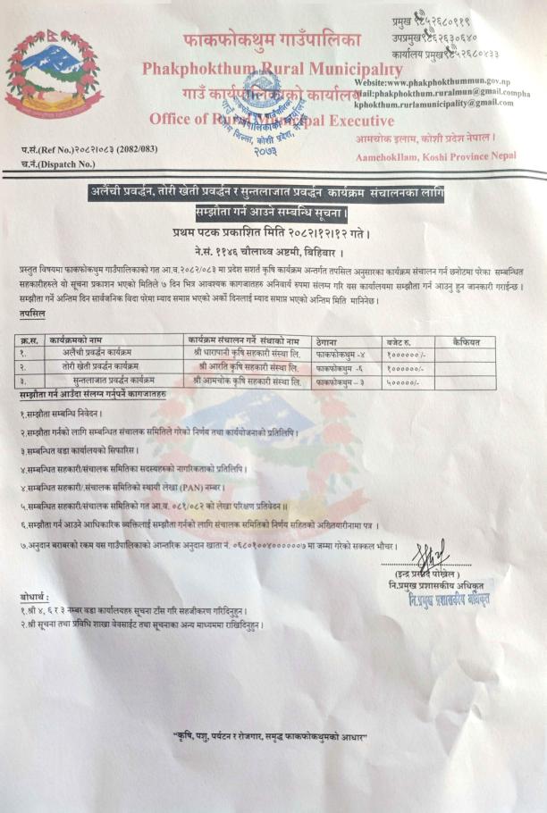 कृषि प्रवर्द्धन कार्यक्रमहरू सञ्चालनका लागि सम्झौता गर्न आउने सम्बन्धी सूचना!!