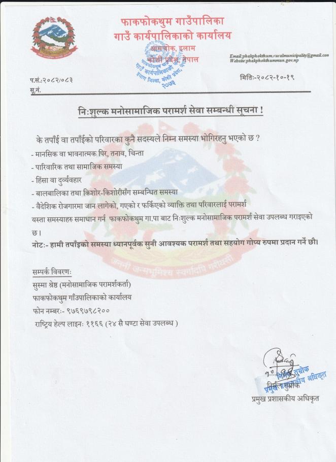नि:शुल्क मनोसामाजिक परामर्श सेवा सम्बन्धी सूचना ।