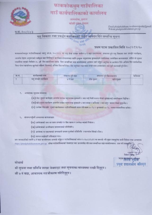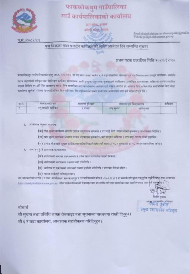 पशु विकास तथा प्रवर्द्धन कार्यक्रम (गोठ सुधार) को लागि आवेदन दिने सम्बन्धी सूचना!!