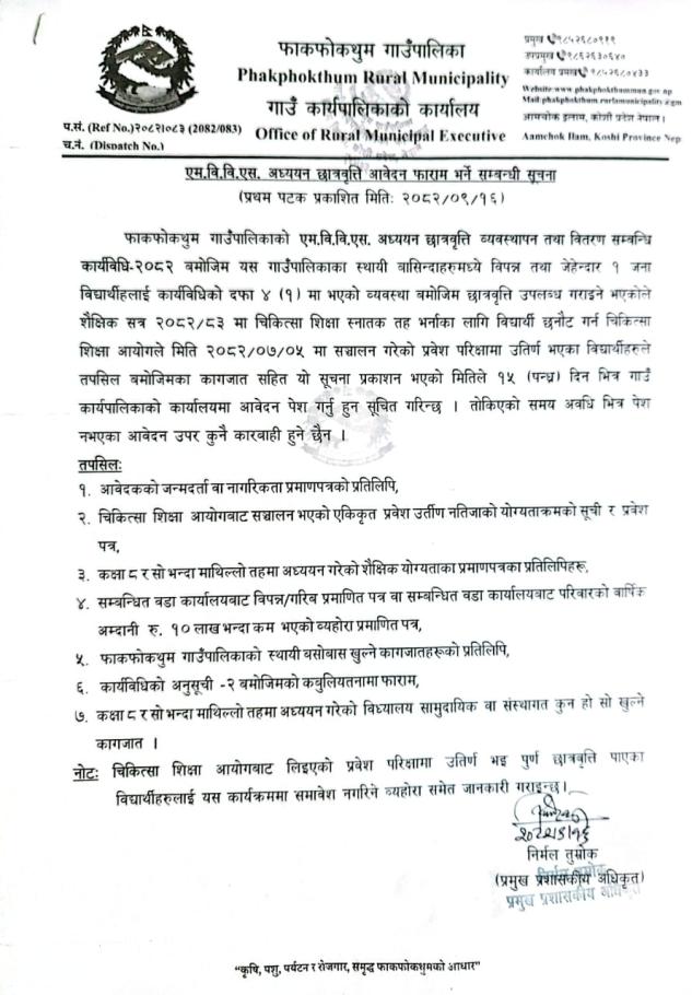 एम बि बि एस अध्ययन छात्रवृत्ति फारम आवेदन सम्बन्धि सूचना ।