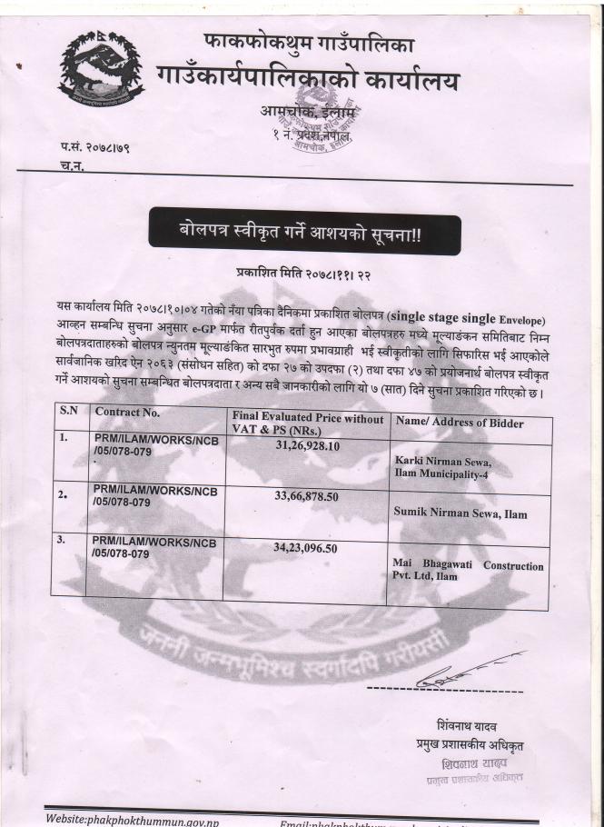 बोलपत्र स्विकृत गर्ने आशयको सूचना !!