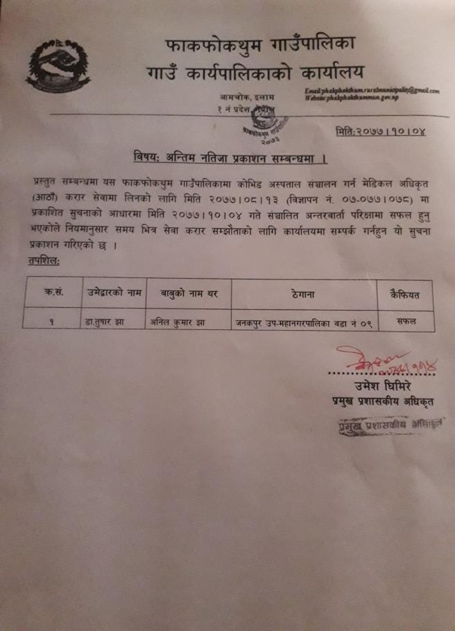 मेडिकल अधिकृतको अन्तिम नतिजा प्रकाशन सम्बन्धमा ।